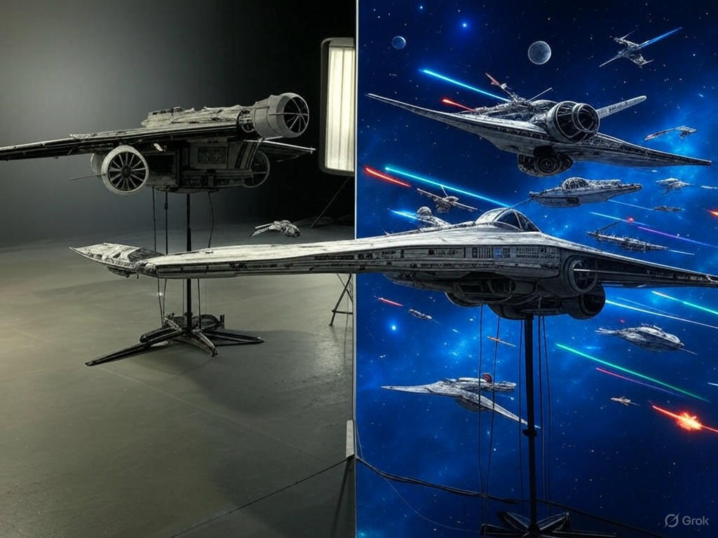 Image 3: [Side-by-side comparison of Star Wars’ space battle. Left: A model spaceship against a black backdrop with minimal lighting. Right: The final shot with the Millennium Falcon in a vibrant space battle, complete with laser effects and distant stars.]